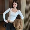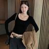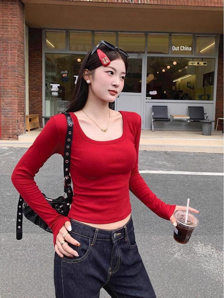 Women's Retro Red U-neck Long-sleeve T-shirt - Slim Fit Korean Style Spicy Girl Top for Autumn/Winter.