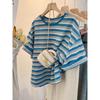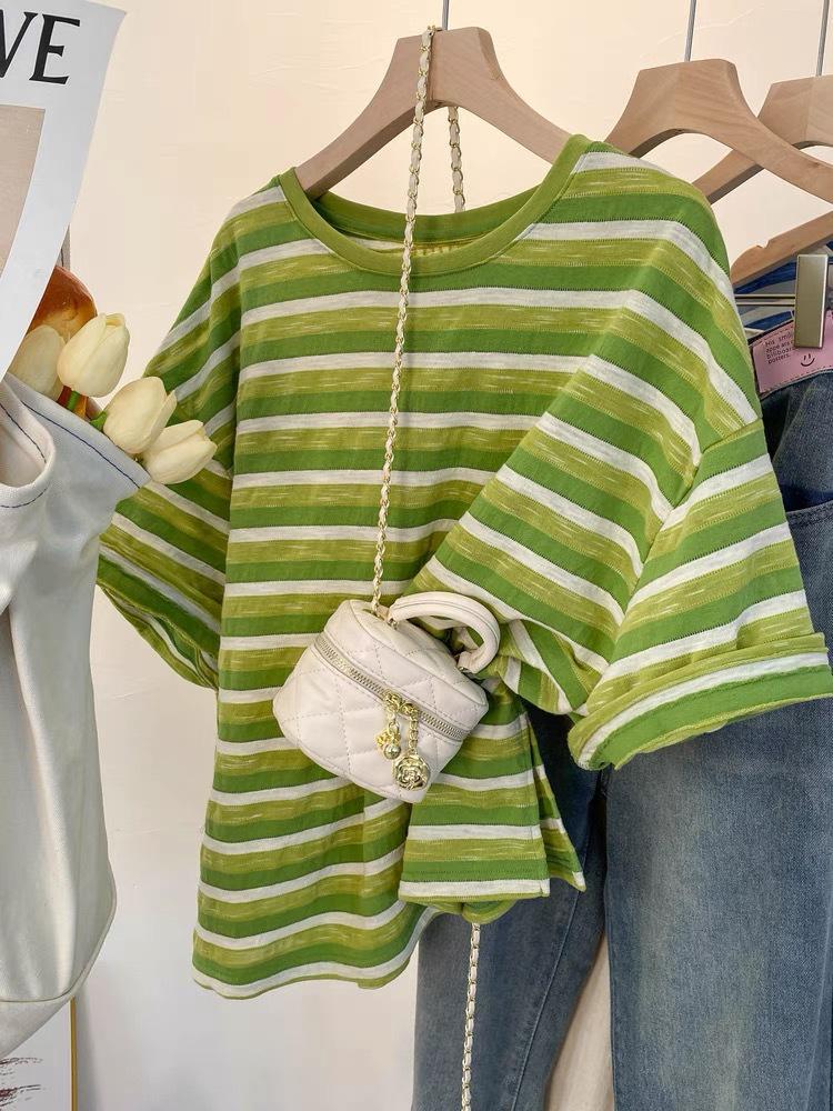 Plus Size Green Striped Short Sleeve Women's Summer T-Shirt - Lightweight, Loose Fit