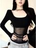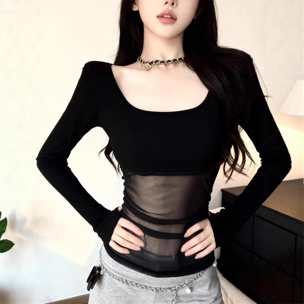 Introducing a sophisticated and stylish top perfect for the cooler seasons. This design features a mesh splice that adds a touch of allure, while the see-through effect provides a chic and modern look. Crafted from high-quality polyester, this top ensures both comfort and durability. The solid pattern offers versatility, seamlessly pairing with your existing wardrobe. The long sleeves and elegant square neckline make this piece an ideal choice for layering or wearing on its own, delivering a touch of grace to any outfit.