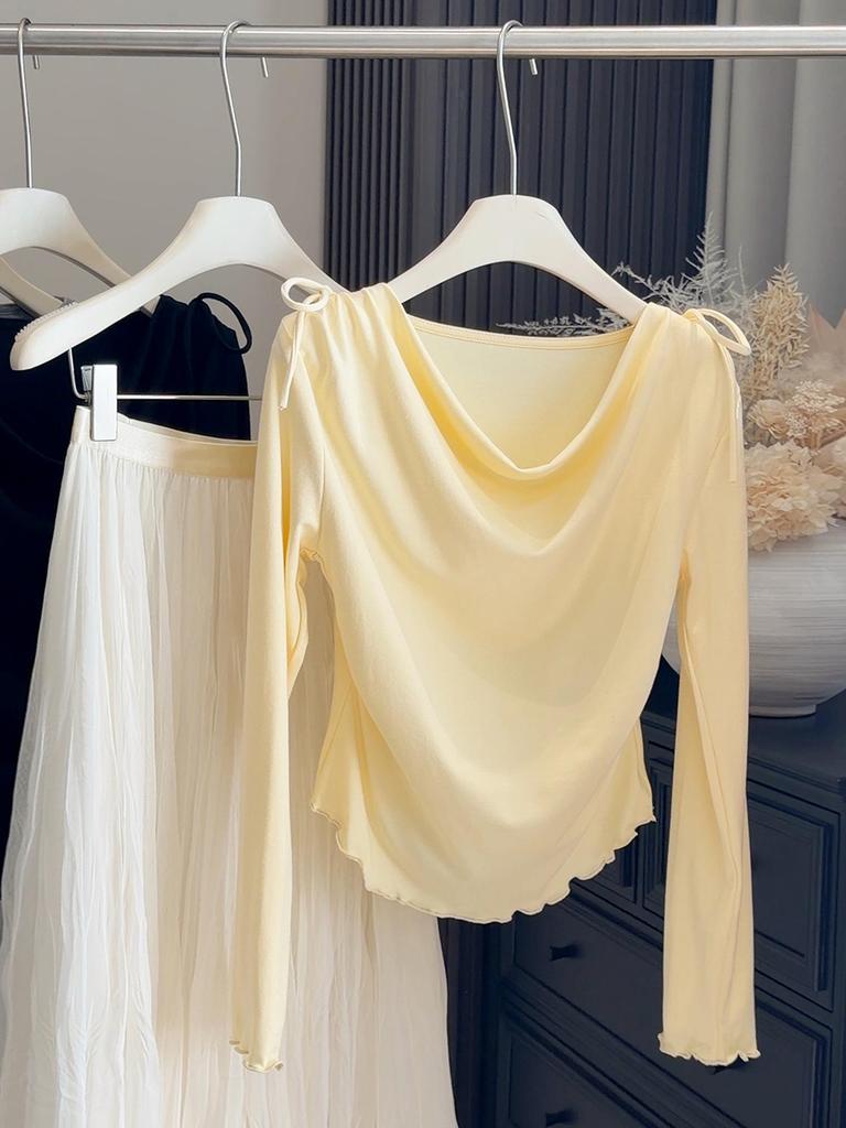 Korean-Style Slim-Fit Flowy Collar Long-Sleeve Tee for Women - Elegant Spring Arrival