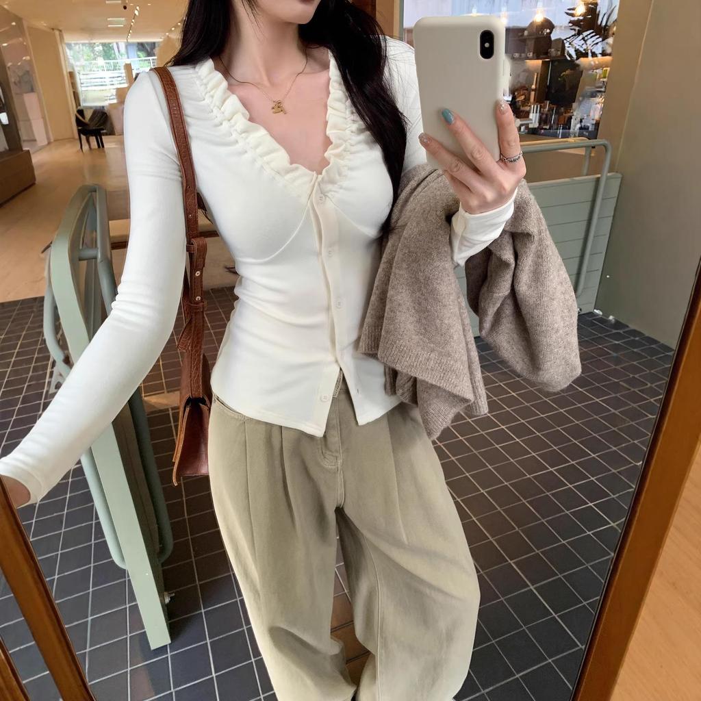 This elegant cardigan is an essential addition to your autumn and winter wardrobe. Crafted from high-quality viscose fiber, it offers both comfort and style. The solid pattern and slimming fit create a flattering silhouette, while the ruffle detailing adds a touch of sophistication. Featuring a classic V-neckline and long sleeves, this cardigan is perfect for layering over your favorite tops or wearing as a statement piece on its own. Ideal for any fashion-forward woman seeking to elevate her seasonal style.
