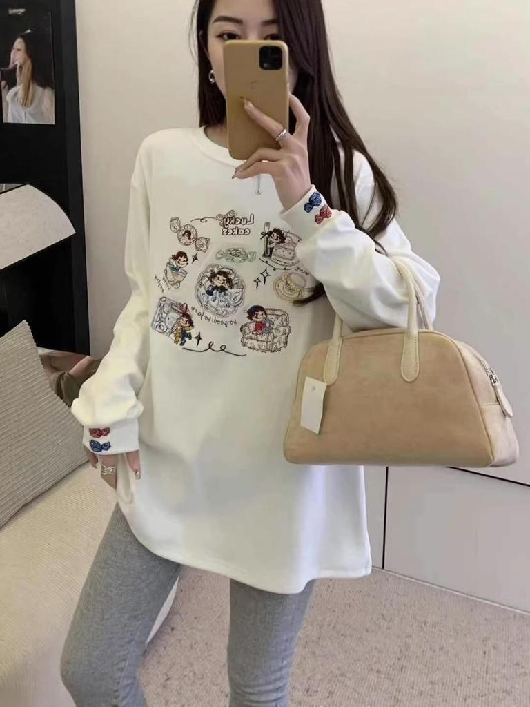 Thickened Brushed Long Sleeve White T-Shirt with Cartoon Embroidery, Autumn/Winter Korean Casual Style