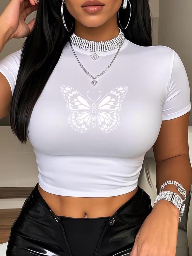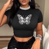 Embrace modern elegance with this stylish black cropped T-shirt, featuring a striking butterfly print. Crafted from high-quality polyester, this top offers a comfortable and slim fit that accentuates the waist. The short sleeves and round neckline add a classic touch, while the letter decoration adds a trendy vibe. Perfect for both casual outings and fashionable events, this top is a versatile addition to any wardrobe.