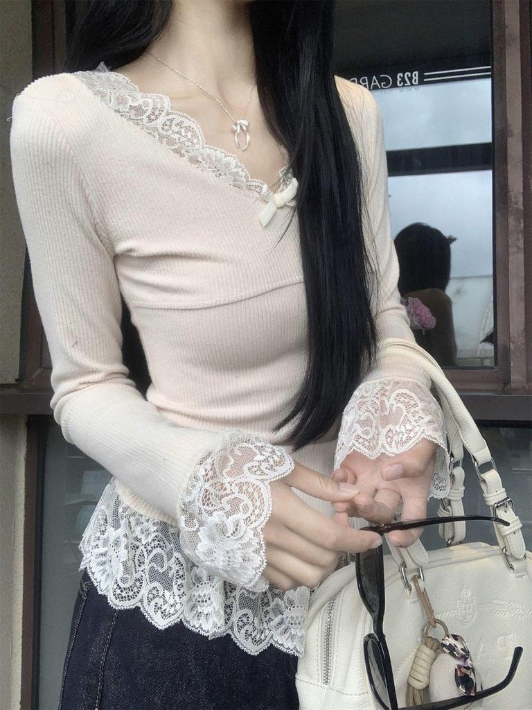 Song Zheng En Women's Apricot Lace Long Sleeve Slim Fit T-shirt for Autumn/Winter