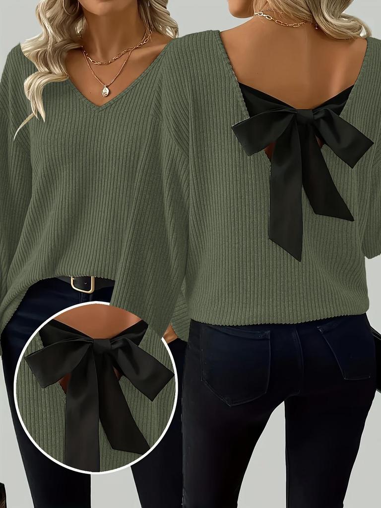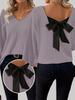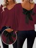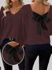 New Autumn Women's V-Neck Solid Sweater with Long Sleeves and Loose Bow Detail