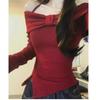 Elegant Red One-Shoulder Bow Long-Sleeve Women's Slim Fit Top - Perfect for Autumn/Winter