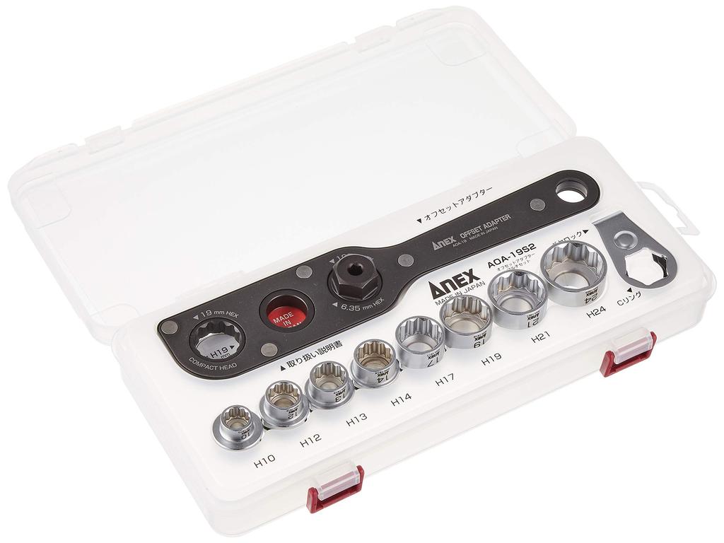 ANEX Offsetový adaptér 19 mm s otočnými šrouby a maticemi v těsném úzkém prostoru Rovný nástroj na matice 19, Plochy, Pouzdro, Vícedílná sada AOA-19S2 [Pro prostory] Práce,