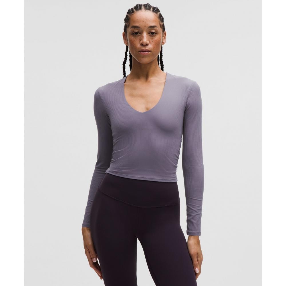 Performance meets elegance in this v-neck long sleeve. Buttery-soft fabric moves with you, a built-in shelf gives gentle support, and cinched sides contour your curves.