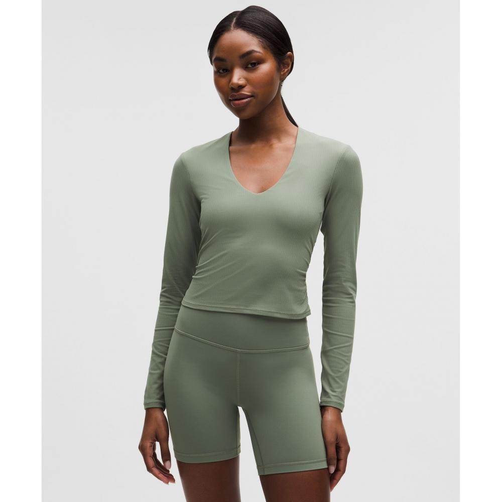Performance meets elegance in this v-neck long sleeve. Buttery-soft fabric moves with you, a built-in shelf gives gentle support, and cinched sides contour your curves.