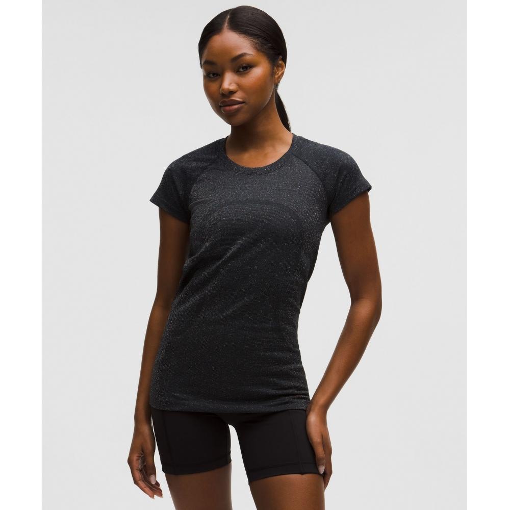 Go ahead, get sweaty. This version of our Swiftly short sleeve features coloured metallic yarns that rival your post-workout glow.
