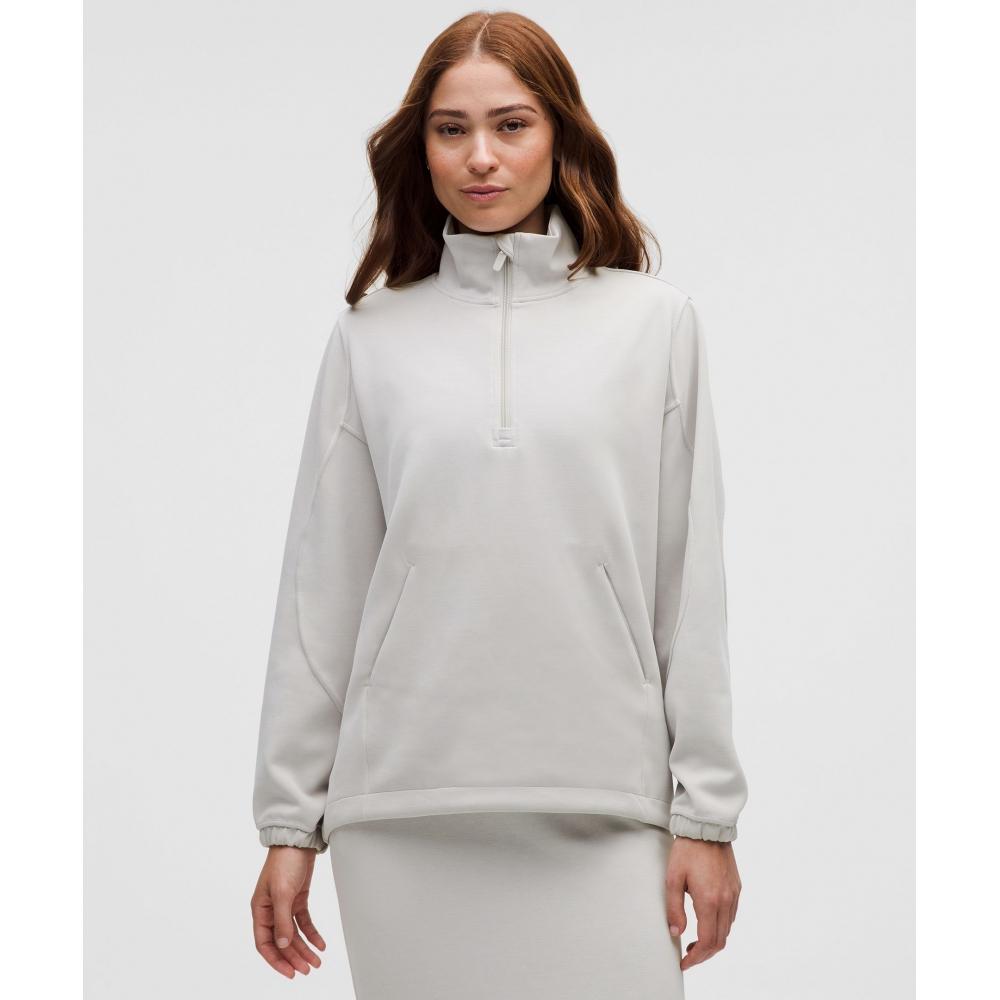 Transition from workout class to coffee shop in comfort. This oversized half zip is a little longer in the back for coverage and has a cinchable hem to adjust the look and length.