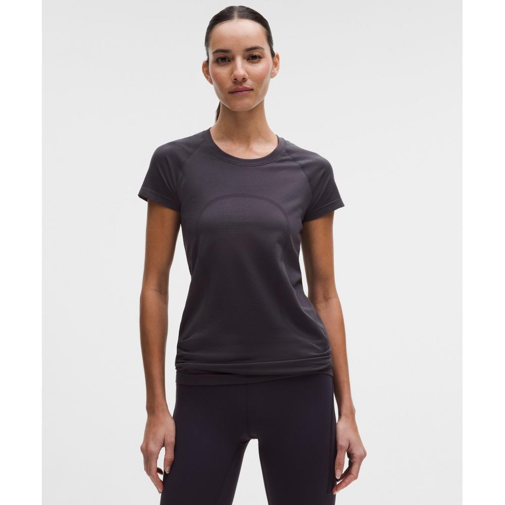 Lululemon Swiftly Tech Short Sleeve Shirt 2.0 Hip Length Spandex Stripe Atmospheric Purple Coal