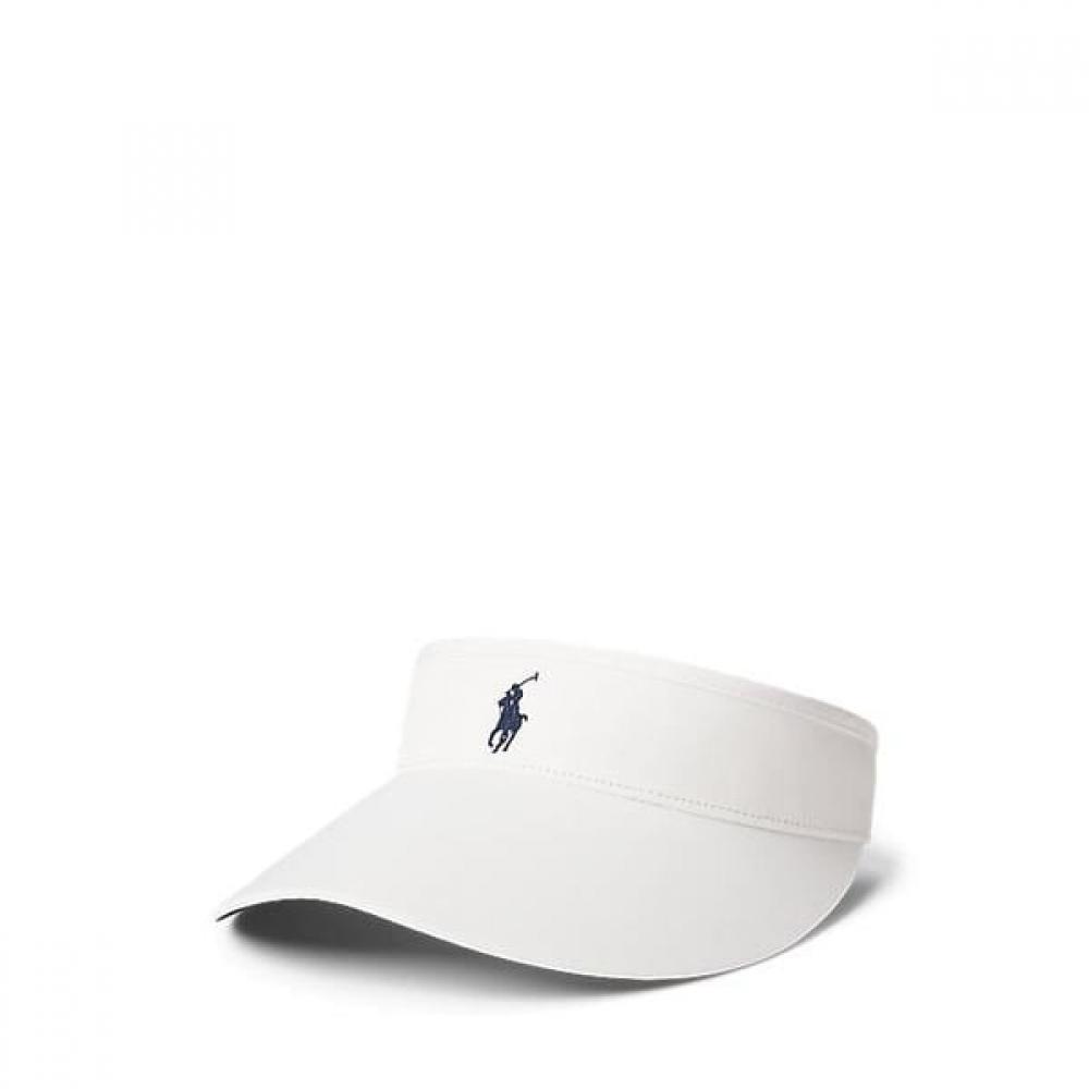 This product is the Polo Golf Women's Embroidered Pony Visor, model number WAXGHGS0J420023100. The front features the signature pony embroidered logo, and it is designed with an internal sweatband and an adjustable hook-and-loop closure for comfortable all-day wear. The product color is white.