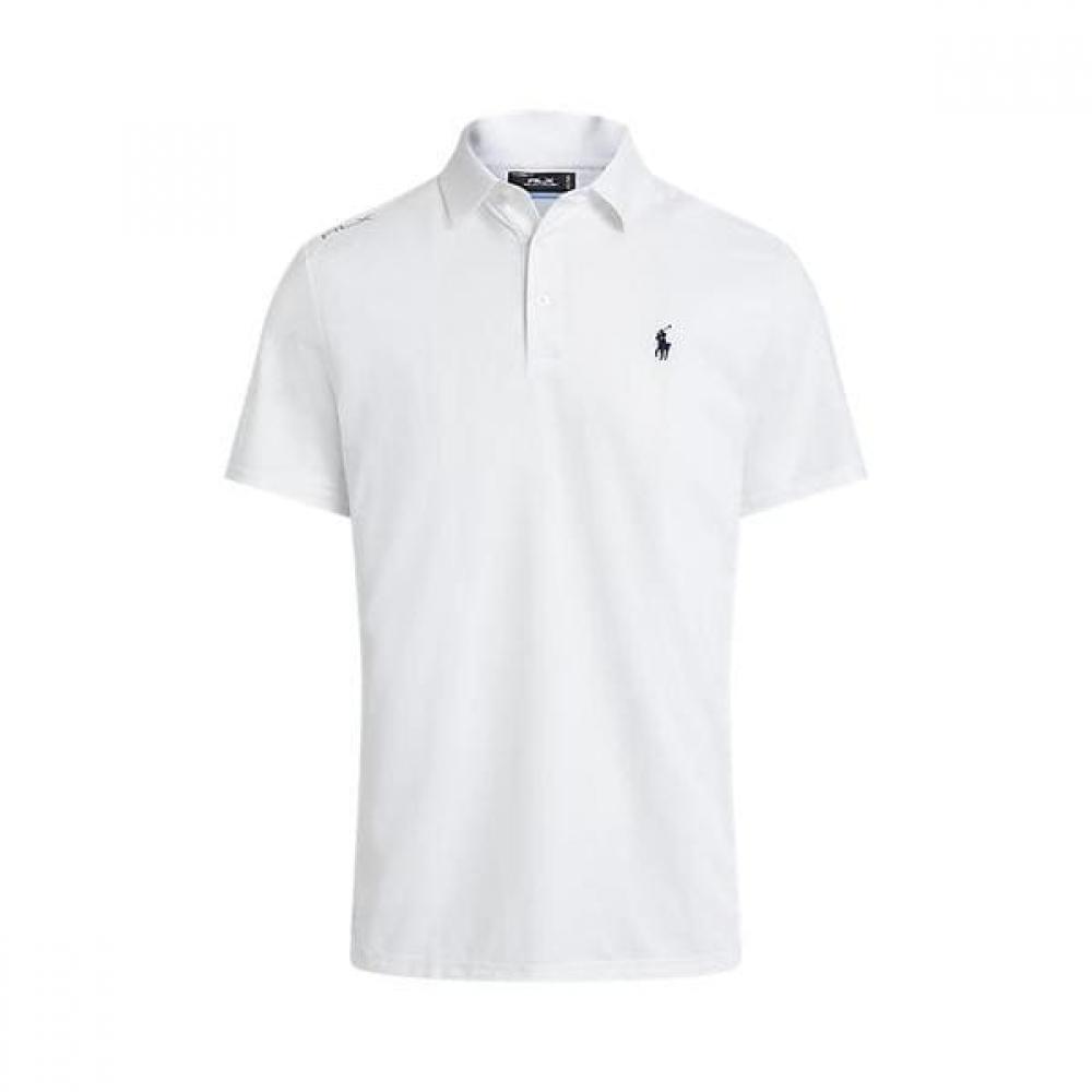 The Polo Golf Men's Performance Mesh Polo Shirt is made from breathable jersey fabric, allowing for comfortable movement. It features a striped knit polo collar and a zip placket, designed in an A-line silhouette to enhance the physique.