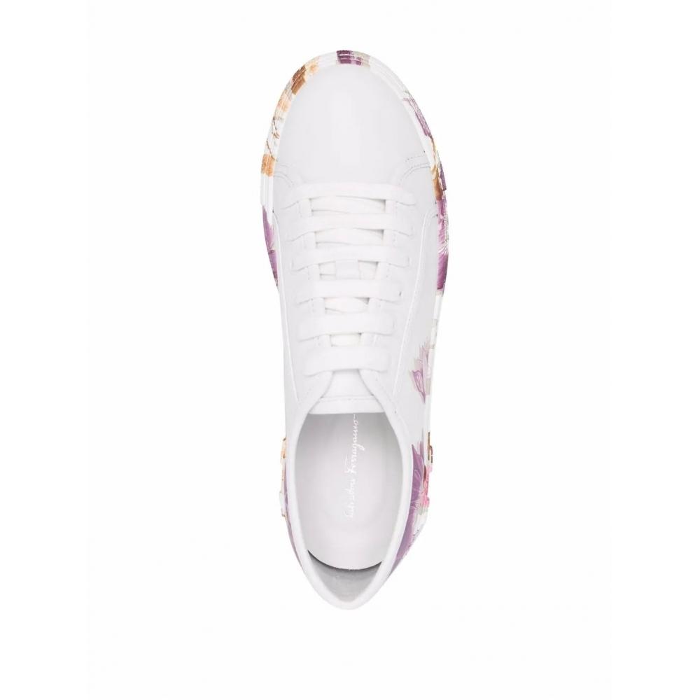 These Salvatore Ferragamo Floral Print Sneakers showcase a combination of white and purple colors, exuding elegance. They feature a leather upper and a round toe design, with a front lace-up fastening to secure the foot. The branded insole adds a touch of luxury, while the chunky rubber sole enhances comfort.