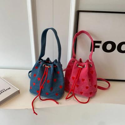Large Capacity Corduroy Bucket Bags Pleated Design Hearts Embroidery Handbag Summer Season