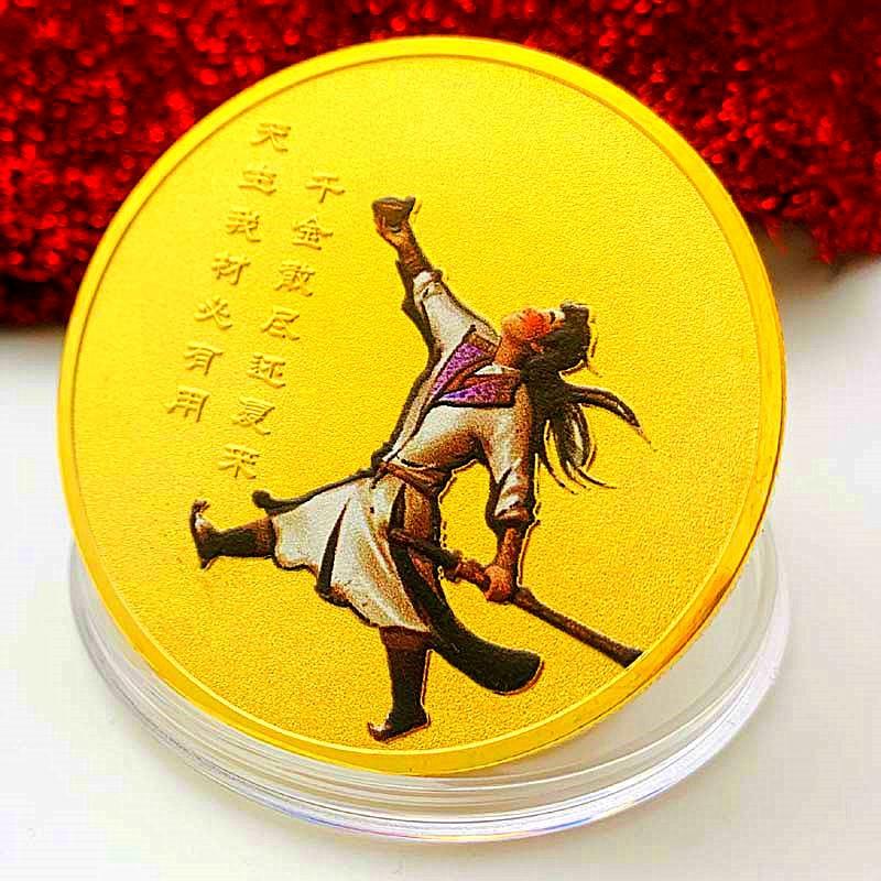 Chinese Tang Dynasty poet Li Bai, gilded color printed commemorative medal, tourist handicraft, Li Bai's hometown poet immortal coin, 45mm gold coin