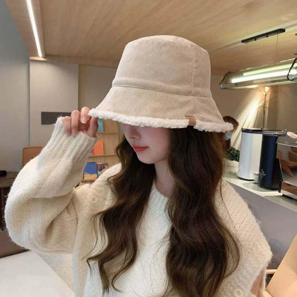 Casual Lamb Wool Bucket Hat Simple Plush Fishman Hat Portable Female Hats Winter Girl