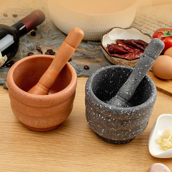 Experience authentic manual grinding with this pestle and mortar set, perfectly designed for crushing spices, herbs, garlic, and more while preserving their original flavors. Featuring a thickened, anti-slip base, it ensures stability and safety during use, enhancing grinding efficiency. Available in classic color combinations including black spots, gray, white, wood color, and dark wood grain, its simple and elegant design complements any kitchen or medicinal setting.
