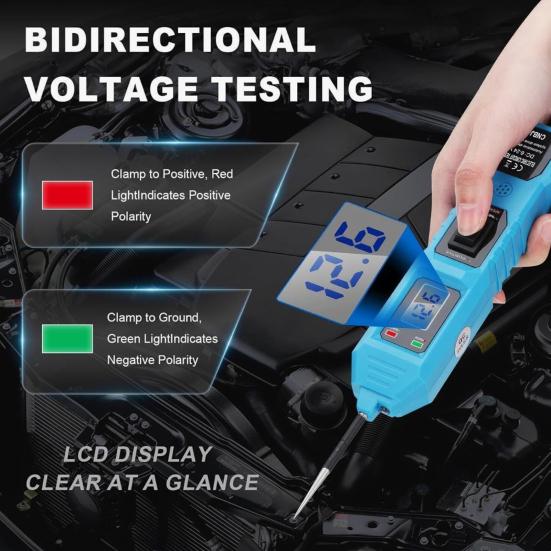 Built-In Front Lighting: Featuring an integrated front lighting system, this tester provides clear visibility in dim or dark environments. This thoughtful design allows users to perform vehicle maintenance and electrical testing at night or in poorly lit spaces with ease and precision, enhancing convenience and reducing the risk of errors during inspections.