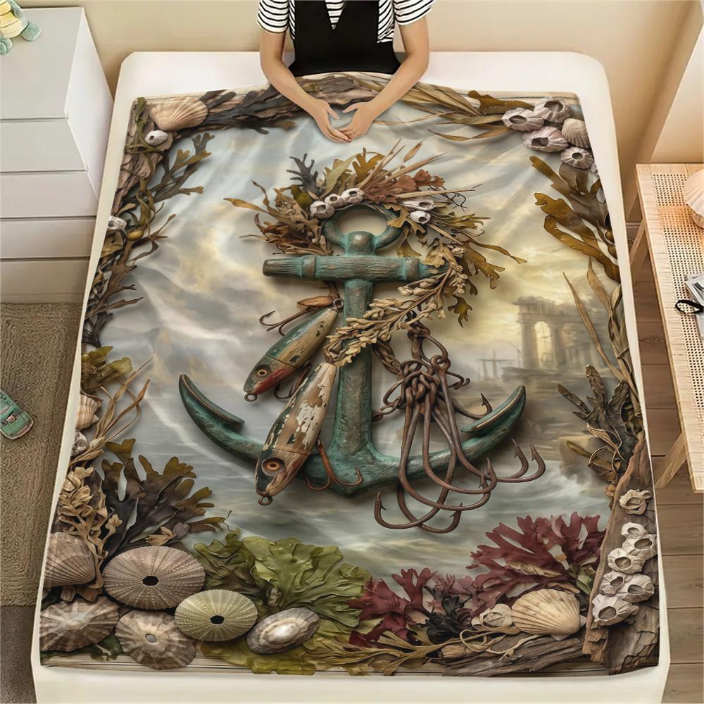 1PC Fish hook Print FlAannel Blanket, High quality Comfortable for All Seasons, Home Decor, Warmth and Comfort