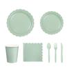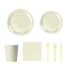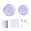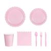 This party tableware supplies set features diverse color designs and paper construction, offering complete 25pcs comes with paper napkins, paper plates, paper cups and plastic cutlery for themed celebration.