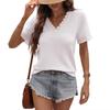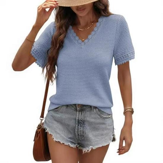 2026 Women's V-Neck Casual Waffle Knit Lace Patchwork Short Sleeve Top