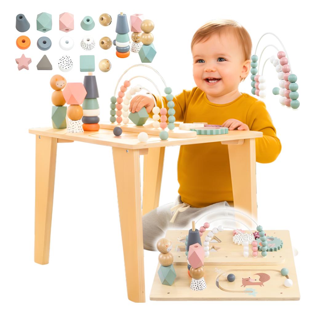 MONTESSORI WOODEN EDUCATIONAL TABLE WITH FOXES ALL ABOUT THE WOODEN EDUCATIONAL TABLE: Colorful wooden educational table for children from 12 months of age Varied activities: abacus, bead maze, gears, shape sorter, stacking blocks Develops fine motor skills and hand-eye coordination Supports logical thinking and learning cause-and-effect relationships Intense colors stimulate vision and color recognition Safe construction with rounded edges and a stable base This wooden activity table is the perfect space for the youngest to discover the world. It was designed to develop manual skills, coordination, and creative thinking in children from 12 months of age. Thanks to the various activities, little ones will not only have a great time, but also develop their skills through play. EXERCISES HAND FINE FINENESS Child grasps, moves, turns and matches pieces, improving fine motor skills. STRENGTHENS HAND-EYE COORDINATION Performing manual tasks teaches precision and focus . STIMULATES THE SENSES Interesting colors, a variety of textures and shapes engage sight and touch. STIMULATES THE IMAGINATION The toddler decides how to play with beads, blocks or figures, creating their own play scenarios . STIMULATES IMAGINATION Playing with mechanisms, matching shapes and sorting stimulate cause and effect thinking. SPECIFICATION: Total dimensions: 59 × 44 × 44 cm Table height: 40 cm Block dimensions: 5x3 cm, 5x5 cm, 5x2 cm, 6x5x4 cm Recommended child's age: 12 m + Toy components: square wooden table, 3 colorful motor loops-abacuses with beads (10), shape sorter (triangle, square, circle, star), 4 gears, slider, 3 pyramid stands (balls with foxes, figures and tires) Montessori-compatible Non-toxic, safe paints CE, EN 71 safety certificate FAQ – frequently asked questions: What age is this table intended for? The recommended age is 12 months and up. Are all the paints safe for children? Yes, non-toxic water-based paints that comply with safety standards were used. Does the table require assembly? Yes, but assembly is quick and intuitive – it only takes a few minutes. What skills does this toy develop? This toy supports the development of fine motor skills, eye-hand coordination, logical thinking, sense of touch, and creativity.