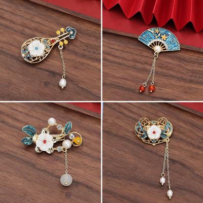 Pearl Hanfu Cheongsam Pin Accessories Antique Fan Pendant Metal Collar Pins Tassel Brooches