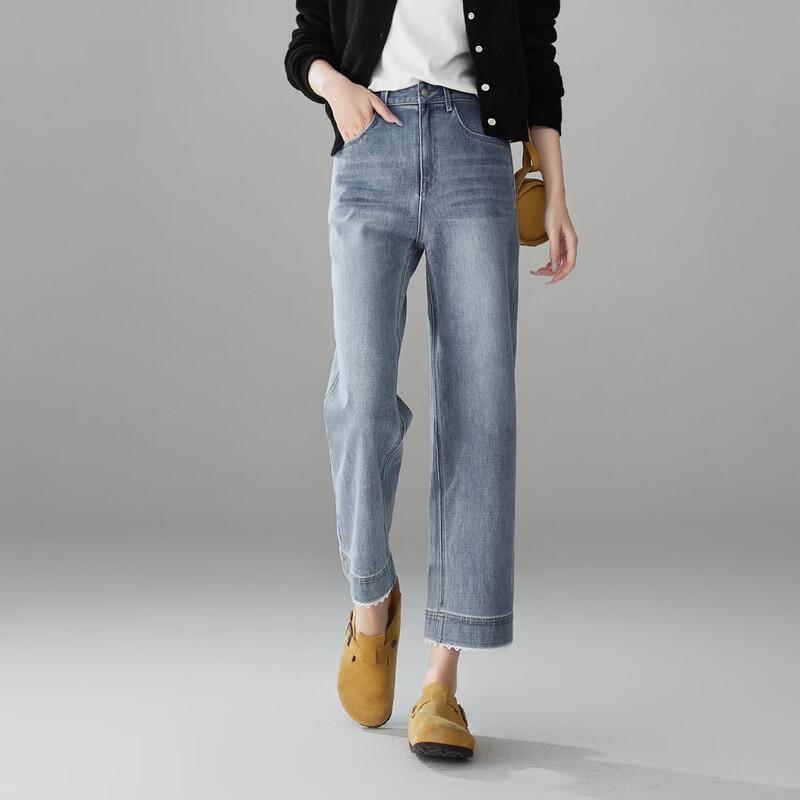 SOFSIL Women's High-Waist Lace Patchwork Cropped Straight Jeans