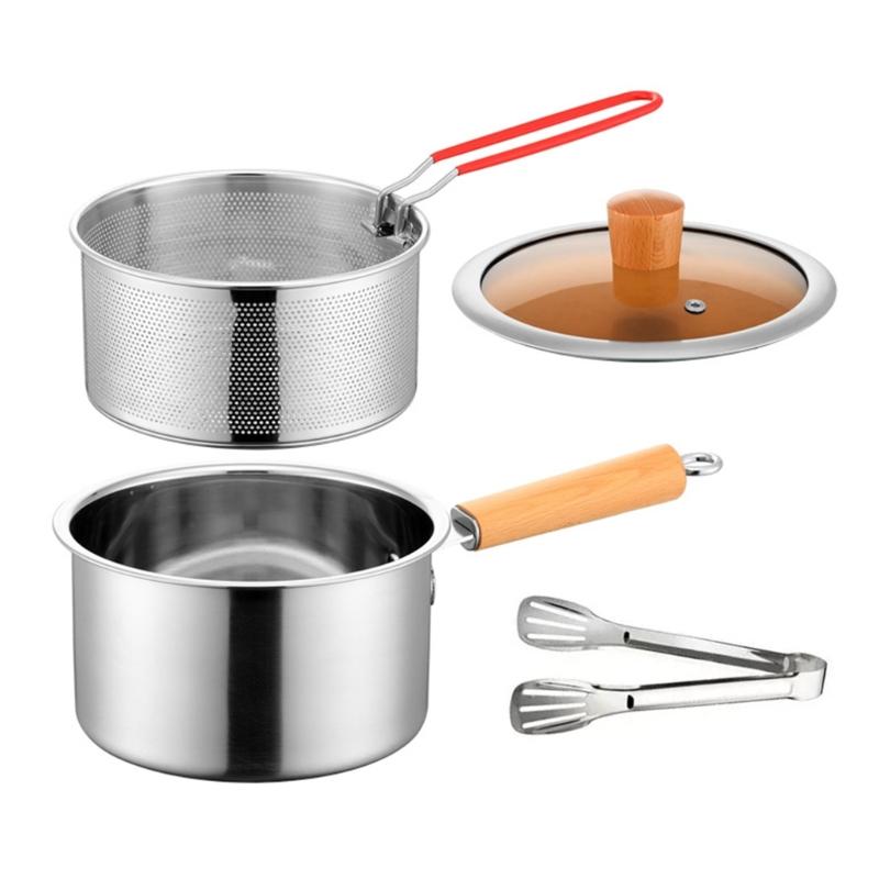 Professional Kitchen Fryers Set with Lid Strainer Basket and Cooking Tongs Wood Handle for Heat Protections Home Use