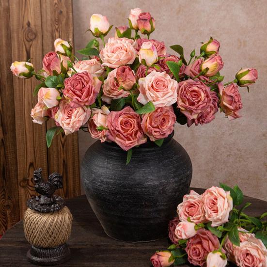 Artificial Flowers 3-Headed French Rose Realistic False Flowers Indoor Outdoor Decoration Wedding Garden Event Photography Props