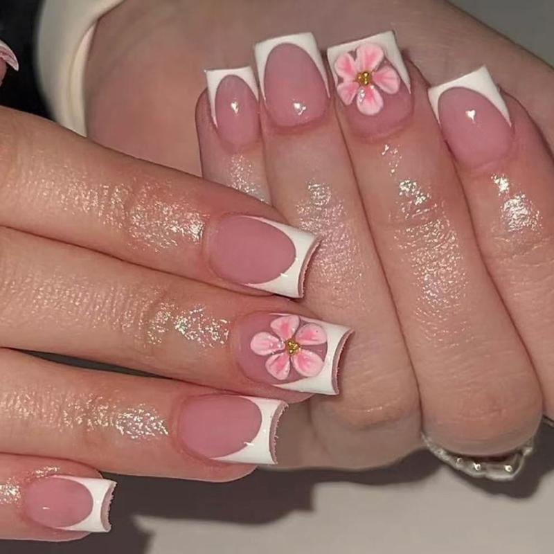 Elegant 3D Raised Flower Press On Nail Pink French Tip Fake Nail Plastic Comfortable Reusable False Nail For Daily Use