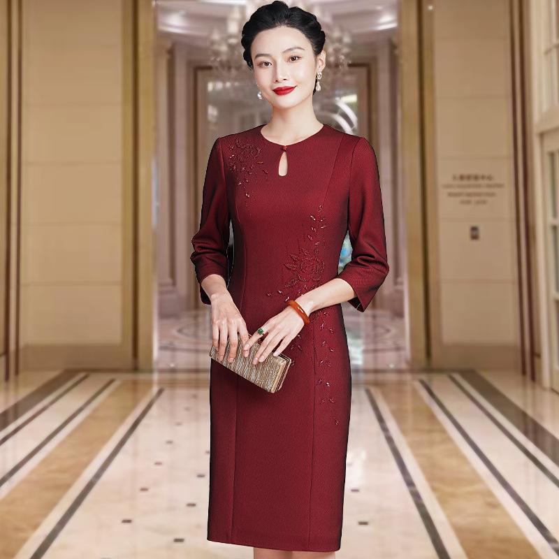 This elegant spring wedding banquet dress is designed for mothers seeking a sophisticated look. Its high-end design features a slimming fit that beautifully contours the figure, complemented by stylish three-quarter sleeves. Made entirely from premium-quality polyester, the dress offers both comfort and durability. The round neckline adds a classic touch, making it a perfect choice for formal occasions.