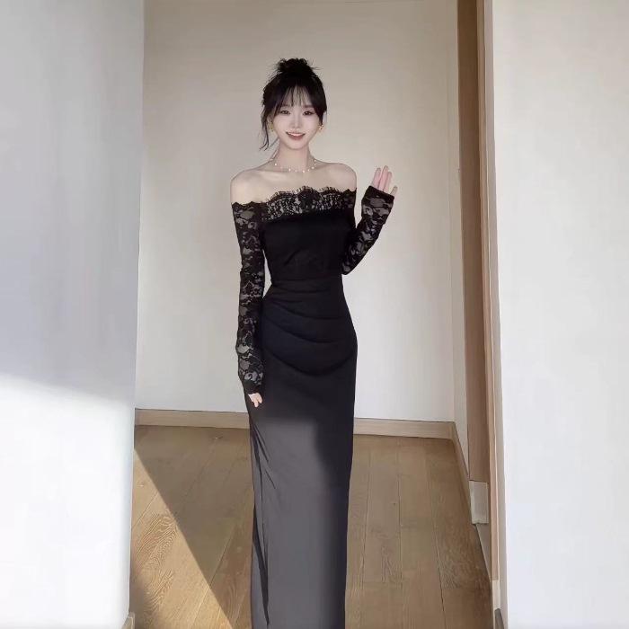 Retro Pure Desire Lace One-Shoulder Dress: Women's 2025 Sexy Long Sleeve, Hip-Hugging Skirt.