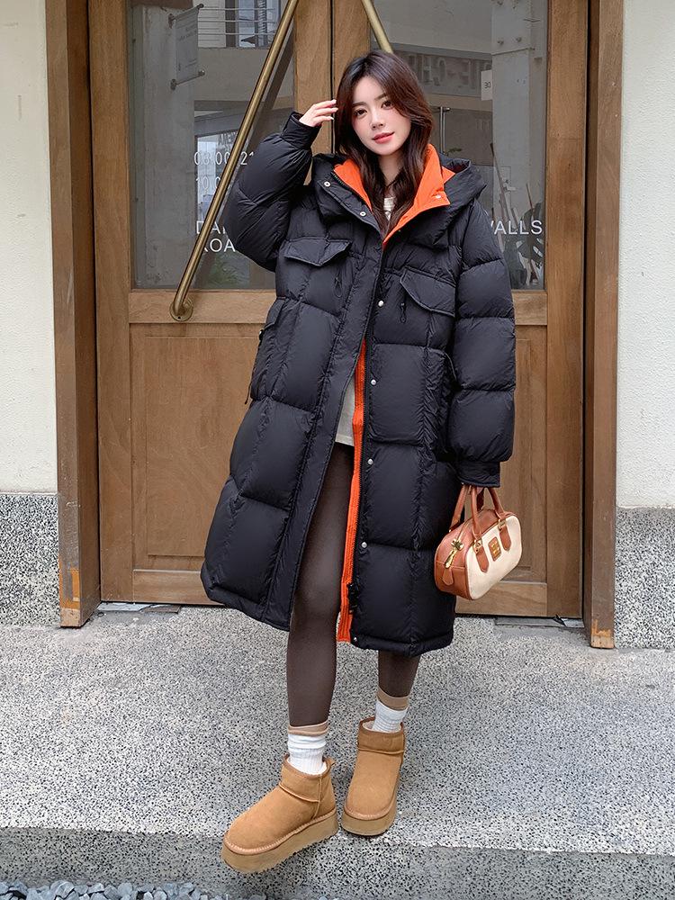 Experience ultimate warmth and style with this extra thick, plus-size long down jacket for women. Designed for a loose fit, it ensures comfort and a flattering silhouette for all body types. Made from durable polyester material, this jacket is filled with duck down for superior insulation. The hooded neckline and long sleeves provide additional coverage against the elements, making it perfect for commuting or casual outings. Embrace the cozy and chic commuting style with this essential winter piece.