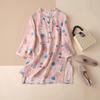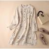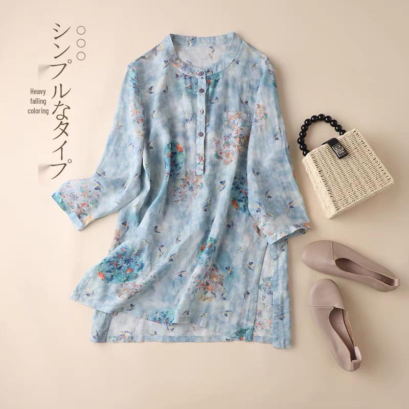 2025 Women's Trendy Loose Nine-Sleeve Printed Ramie Stand Collar Pullover Shirt