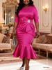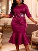 Tyto šaty jsou úžasnou volbou pro ty, kdo hledají eleganci a sofistikovanost.. Vyrobeno z vysoce kvalitního polyesteru, má jednobarevný vzor, který nabízí nadčasovou estetiku.. Design je vylepšen nádhernými korálkovými ozdobami v pase, které dodávají nádech půvabu.. Kulatý výstřih a tříčtvrteční rukávy poskytují klasický a decentní vzhled, zatímco střih do mořské panny krásně zvýrazňuje křivky.. Tento večerní šat je dokonalý pro formální příležitosti a zajistí vám nezapomenutelný dojem.