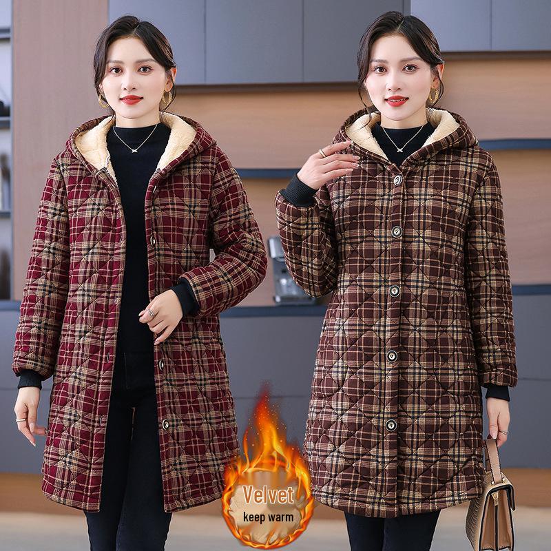 Wrap yourself in comfort and style with this chic mid-length winter coat, perfect for middle-aged and elderly individuals. Designed with a classic plaid pattern, this coat features a cozy fleece lining that ensures warmth during the colder months. The medium thickness provides just the right amount of insulation without being bulky. A sophisticated V-neckline adds a touch of elegance, making it suitable for both casual outings and more formal occasions. Whether running errands or attending social gatherings, this coat offers a blend of fashion and functionality, making it a must-have for any winter wardrobe.