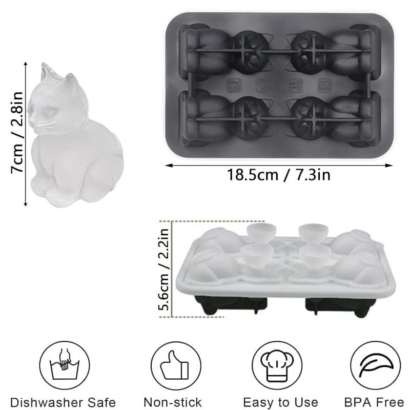 Unique 3D Cat Ice Cube Design: Create four adorable 3D cat-shaped ice cubes that melt slowly and evenly, keeping your drinks cool longer without watering them down. Add a playful and elegant touch to your whiskey, cocktails, or iced coffee with these fun cat ice molds.