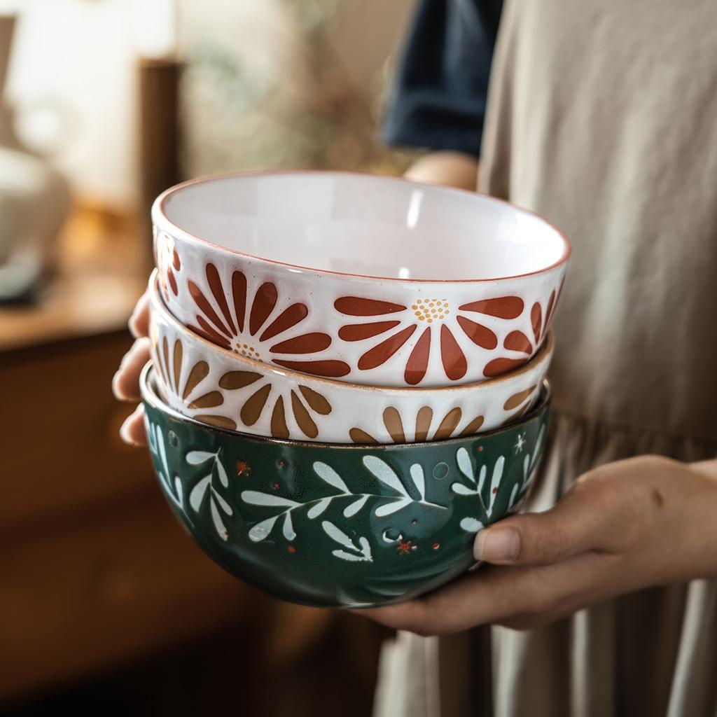 Pastoral Flower Ceramic Bowl Salad Bowl Round Noodle Bowl Household Retro Style Tableware Bowl Vegetable Bowl Soup Noodle Bowl