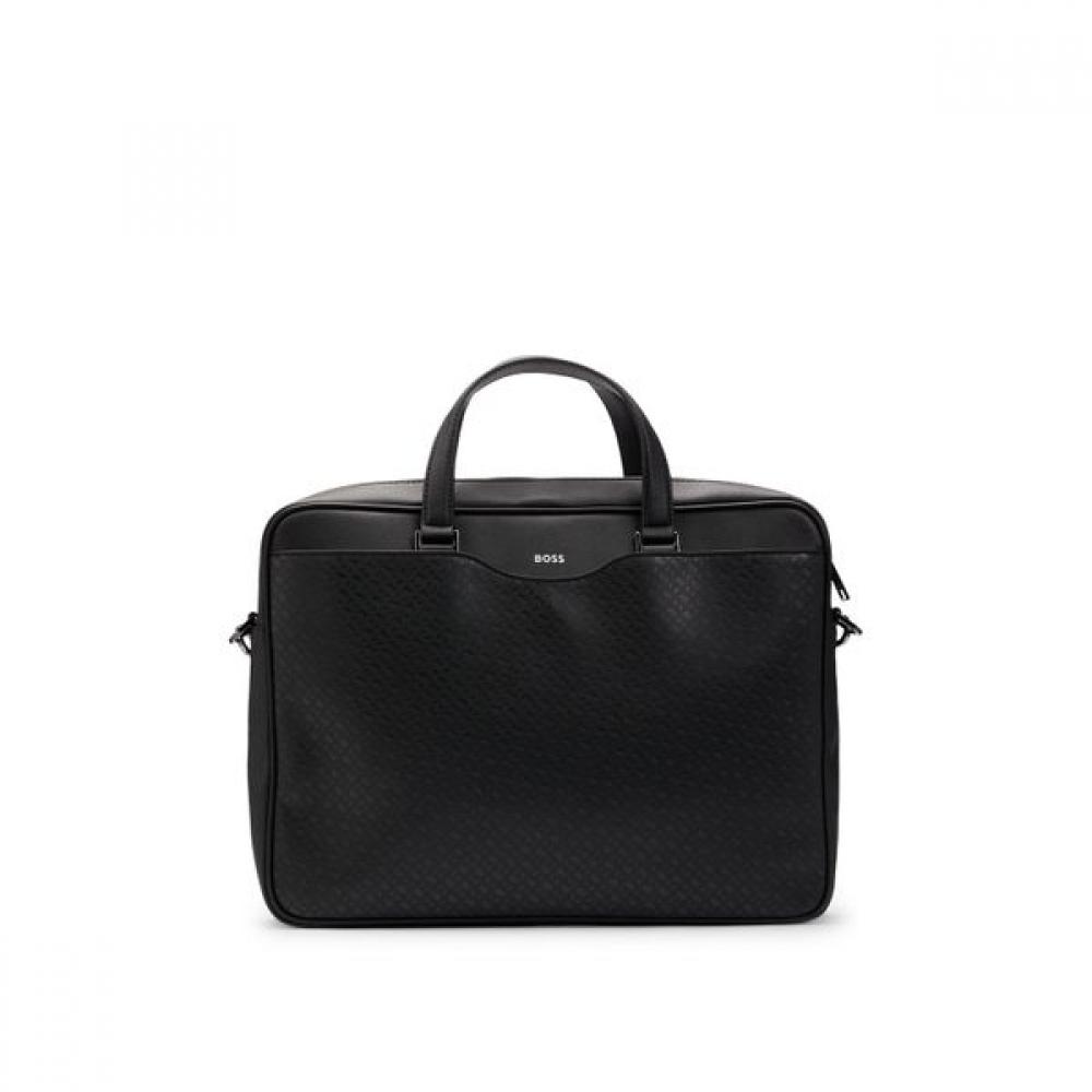 The BOSS Monogram Document Case Black SU25 is a smart and unique document case from BOSS Menswear, designed to hold essentials neatly. This product features a monogram panel and is made of soft synthetic material. The foil print branding adds a luxurious touch. It comes with a detachable and adjustable strap for convenience. The size is 30 x 40 x 8cm.