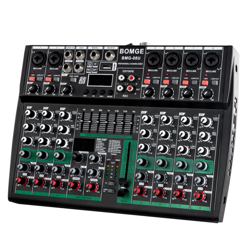 8-Channel Audio Mixer - The mixing console is ideal for connecting multiple devices. It features six XLR line input jacks for connecting microphones and guitars, a 1/4-inch jack (6.35mm) insert, and a line mic input on channels 7 and 8. The insert inputs provide the ability to mix microphone audio with instruments like guitars, pianos, and keyboards. AUX: 1 AUX. Outputs: 6.5mm (1/4-inch), RCA (stereo).