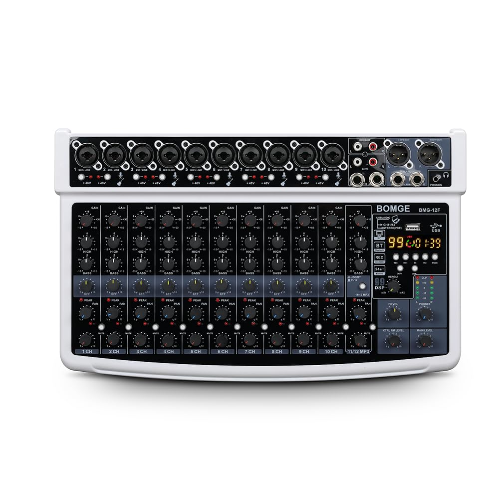 BOMGE Professional Audio Bluetooth Studio Mixer with 48V and 99 DSP Effects Professionals and 12-Channel Mixer, USB, Power, XLR/RCA Inputs, (For