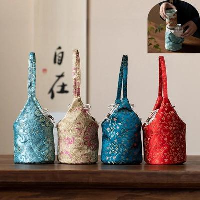 Přenosná úložná taška na čajové šálky v čínském stylu, vyšívaná zesílená látková taška se stahovací šňůrkou na čajové šálky, vintage doplňky k čajové soupravě