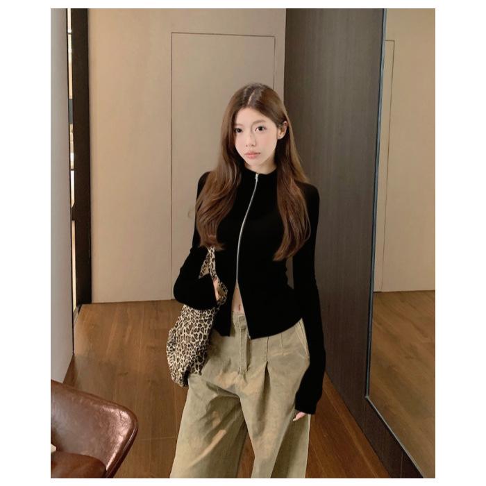 Embrace style and comfort with this Women's Versatile Knit Cardigan, designed for both spring and autumn 2025. Crafted from a polyester-spandex blend, this jacket offers flexibility and a refined fit. Its unique design features a round neckline that transitions smoothly to a stand collar, adding a touch of sophistication to your ensemble. Ideal for layering, its double zipper allows for adjustable styling, while the absence of sleeves makes it perfect for warmer days. Whether you're dressing up for a casual outing or adding a chic layer to your attire, this ribbed, slim-fit cardigan is a must-have addition to your wardrobe.