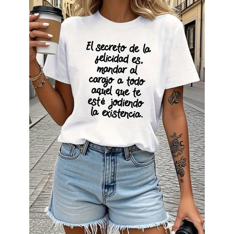 European sizes El Secreto De La Felicidad Es Letter Print T-shirt, Short Sleeve Crew Neck Casual Top for Summer & Spring