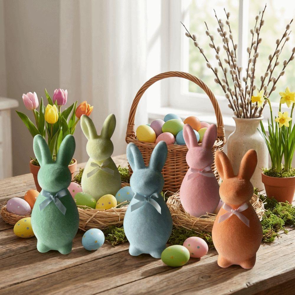 with Bow Easter Bunny Statue Plush Bunny Sculpture Flocked Rabbit Figures Indoor Table