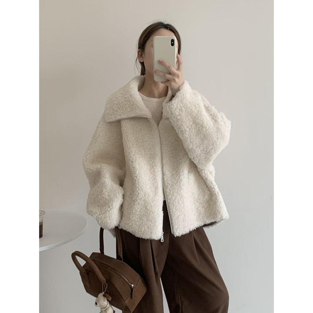 Women's Lamb Wool Thickened Short Jacket - Versatile Korean Fashion, Loose Fit & Slimming, Autumn/Winter Fuzzy Fur One-Piece.