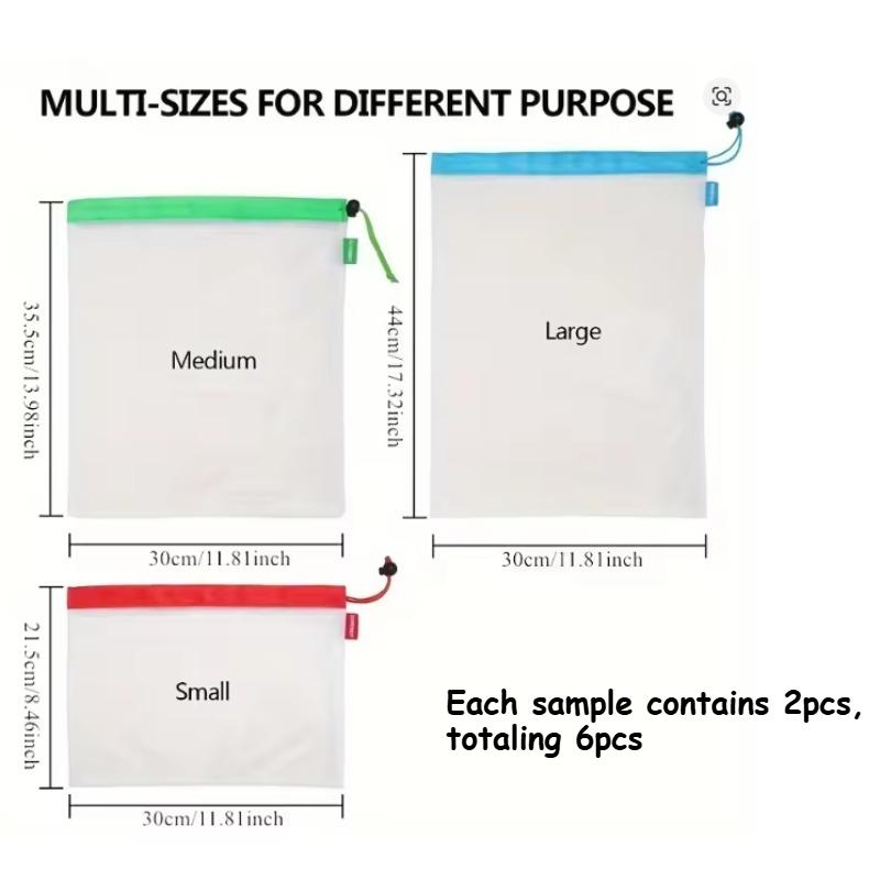 6pcs Mesh Storage and Organizer Bags, Washable Shopping Bags for Toy, Fruit and Vegetable Storage, Drawstring Reusable Mesh Bags